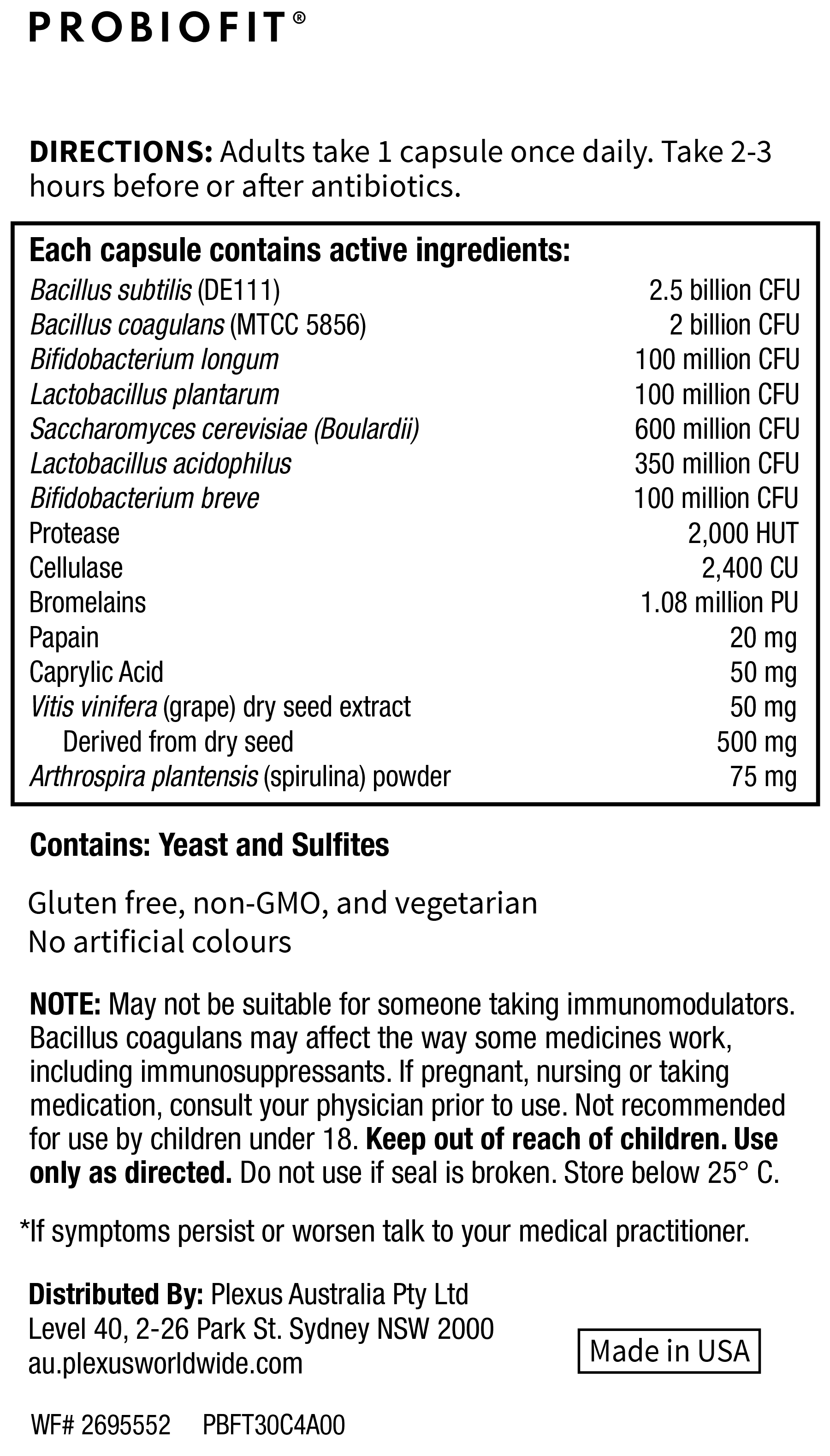 | What are the botanicals in ProBioFit? | The botanicals included in ProBioFit are Grape Seed Extract and Spirulina Powder. |